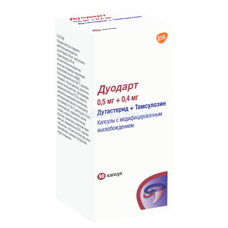 Препарат для лечения доброкачественной гиперплазии предстательной железы. Альфа-адреноблокаторы. После приема одной дозы дутастерида максимальная концентрация препарата в сыворотке достигается в течение 1-3 ч. Абсолютная биодоступность составляет около 60 % по отношению к 2-часовой внутривенной инфузии. Биодоступность дутастерида не зависит от приема пищи. Тамсулозина гидрохлорид хорошо всасывается в кишечнике и обладает почти 100 % биодоступностью. Тамсулозина гидрохлорид характеризуется линейной кинетикой, как при однократном, так и при многократном режиме дозирования. При однократном режиме дозирования равновесная концентрация тамсулозинагидрохлорида достигается к 5-му дню. Всасывание тамсулозина гидрохлорида замедляется после приема пищи. Одинаковый уровень всасывания может быть достигнут в том случае, если пациент принимает тамсулозина гидрохлорид ежедневно, через 30 минут после одного и того же приема пищи.
