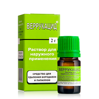 Веррукацид® предназначен только для наружного применения. Препарат наносят точно на обрабатываемый участок специальным аппликатором или небольшой тонкой деревянной палочкой, не допуская попадания его на соседние здоровые участки кожи и слизистые оболочки. На мелкие папилломы (размером до 2 мм) и нитевидные бородавки Веррукацид® наносят однократно. Более крупные папилломы и небольшие бородавки (размером 2-3 мм) смазывают препаратом 3-4 раза, делая перерывы для подсыхания нанесенной жидкости. Перед удалением Веррукацидом® бородавок с плотной ороговевшей поверхностью на кистях, подошвенных бородавок, кератом, сухих мозолей необходимо устранить с их поверхности роговые наслоения. Для этого на несколько часов наносят кератолитическую мазь (например, 10% салициловую или др.), покрывая смазанный участок компрессной бумагой или полиэтиленовой пленкой, а затем используют марлевую повязку. Возможно заклеивание лейкопластырем. После этого повязку или лейкопластырь снимают, кожу распаривают в горячей воде с добавлением мыла и соды в течение 10-15 минут и удаляют роговые наслоения (срезают маникюрными ножницами или щипцами). На подсушенную кожу наносят Веррукацид® несколько раз, делая 3-4-минутные перерывы для подсыхания препарата. Бородавки на кистях и подошвах обрабатывают препаратом Веррукацид® 7-10 раз с интервалом 3-4 мин. Кератомы и сухие мозоли достаточно обработать 3-4 раза с интервалом 3-4 мин. При необходимости многократного нанесения препарата во избежание ожога окружающей кожи целесообразно смазать ее цинковой пастой. Паста удаляется сухим марлевым тампоном после подсыхания последней порции Веррукацида®. Остроконечные кондиломы не рекомендуется удалять самостоятельно, их обработка Веррукацидом® проводится в процедурном кабинете поликлиники дерматовенерологом или урологом. Препарат Веррукацид® наносят на каждый элемент в отдельности 1-2 раза с интервалом в 3-4 мин. Повторную обработку при необходимости проводят через 6-8 дней после отпадения корочки. Допускается проведение 4-5 процедур.