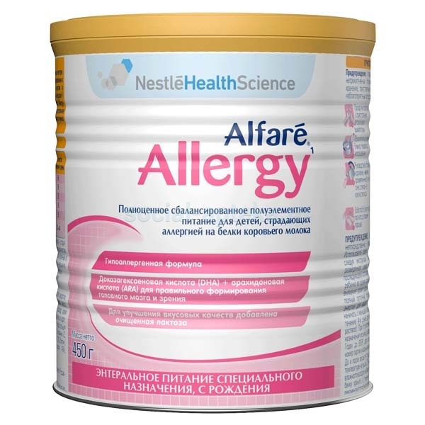 Alfare® Allergy - лечебная смесь на основе высокогидролизованного сывороточного белка для первой линии диетотерапии детей с аллергией на белок коровьего молока с кожными проявлениями Специализированный пищевой продукт диетического лечебного питания, полноценное сбалансированное полуэлементное питание «Alfare® Allergy» для детей, с рождения страдающих аллергией на белки коровьего молока Преимущества -Высокогидролизованный белок 100% молочной сыворотки с доказанной клинической эффективностью в большинстве случаев аллергии на белок коровьего молока, более того: -Обеспечивает физиологические потребности ребенка в нутриентах в соответствии с шаблоном грудного молока (максимальная приближенность); -Содержит лактозу в сочетании с мальтодекстрином в соотношении 1 : 1 -DHA и ARA в соотношении 1 : 1 - аналогично грудному молоку -Приятный вкус для обеспечения долгосрочного кормления и переносимости -Осмолярность 252 мОсм/л – в рамках физиологической нормы Alfare® Allergy (Алфаре Аллерджи) призван помочь малышам, страдающим аллергией на белок коровьего молока, которые не получают грудное молоко и не могут получать стандартные смеси. Основным фактором борьбы с аллергией на белок коровьего молока в смеси Alfare® Allergy является специальный высокогидролизованный белок молочной сыворотки. Вместе с тем смесь отличает хороший вкус, что облегчает переход на этот продукт и его длительное использование. Пищевая ценность Alfare® Allergy аналогична пищевой ценности стандартной детской смеси и приближена к аминокислотному составу грудного молока. Смесь создана на основе рекомендаций AAP и ESPACI/ESPGHAN (Американская академия педиатров и Европейское общество детских аллергологов и иммунологов / Европейское общество детских гастроэнтерологов, гепатологов и нутрициологов). Пищевая ценность Алфаре Аллерджи аналогична пищевой ценности стандартной детской смеси и приближена к аминокислотному составу грудного молока. Эффективность применения продукта Alfare® Allergy подтверждена клиническими исследованиями. Alfare® Allergy является продуктом строгого врачебного назначения и должен применяться под наблюдением врача.