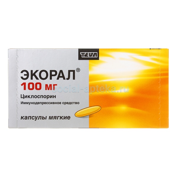 Суточную дозу препарата Экорал следует делить на 2 приема. Приведенные ниже диапазоны доз для приема препарата Экорал внутрь следует рассматривать лишь как рекомендации. Следует проводить общепринятый контроль концентрации циклоспорина в крови. На основании полученных результатов, определяют величину дозы, необходимую для достижения нужного уровня концентрации циклоспорина у различных пациентов. Капсулы препарата Экорал следует запивать водой и проглатывать целиком. Из-за возможного взаимодействия с Р450 -зависимой ферментной системой грейпфрут или грейпфрутовый сок не следует употреблять за 1 ч перед приемом дозы препарата. Трансплантация При трансплантации солидных органов лечение Экоралом должно быть начато за 12 ч до операции в дозе 10-15 мг/кг, разделенной на 2 приема. В течение 1-2 недель после операции препарат назначают под контролем концентрации циклоспорина в крови, до достижения поддерживающей дозы 2-6 мг/кг/сут (в 2 приема). В тех случаях, когда Экорал назначают в комбинации с ГКС, а также в составе трехкомпонентной или четырехкомпонентной терапии, доза препарата может быть уменьшена даже на начальном этапе терапии (3-6 мг/кг/сут в 2 приема) или скорригирована в процессе лечения с учетом концентрации циклоспорина в крови и динамики показателей безопасности (концентрации мочевины, креатинина сыворотки крови и АД). При трансплантации костного мозга начальную дозу следует назначать за сутки до проведения операции. Суточная доза Экорала должна составлять 12.5 мг/кг, поделенные на 2 приема. Поддерживающую терапию проводят не менее 3 мес (предпочтительнее – 6 мес), после чего дозу циклоспорина постоянно снижают до нуля в течение 1 года. Показания, не связанные с трансплантацией При эндогенном увеите для достижения ремиссии препарат назначают в начальной суточной дозе 5 мг/кг перорально в 2 приема до исчезновения признаков активного воспаления и улучшения остроты зрения. В случаях, трудно поддающихся лечению, доза может быть увеличена до 7 мг/кг/сут на непродолжительный период. Если не удается контролировать ситуацию с помощью монотерапии Экоралом, то для достижения начальной ремиссии или для купирования приступа воспаления можно добавить в комплексную терапию системные ГКС в суточной дозе 0.2-0.6 мг/кг преднизолона (или другого препарата ГКС в эквивалентной дозе). В ходе поддерживающей терапии дозу следует медленно снижать до достижения наименьшей эффективной дозы, которая в период ремиссии заболевания не должна превышать 5 мг/кг/сут. При нефротическом синдроме для достижения ремиссии рекомендуемая суточная доза составляет 5 мг/кг для взрослых и 6 мг/кг для детей (в 2 приема), при условии нормальной функции почек. У больных с нарушением функции почек начальная доза не должна превышать 2.5 мг/кг/сут. Если при применении одного препарата Экорал не удается достичь удовлетворительного эффекта, особенно у стероидорезистентных больных, то рекомендуется его комбинировать с пероральными ГКС в низких дозах. Если после 3 мес лечения не удалось достичь улучшения, Экорал следует отменить. При ревматоидном артрите в течение первых 6 недель лечения рекомендованная доза составляет 3 мг/кг/сут в 2 приема. В случае недостаточного эффекта суточная доза может быть постепенно увеличена, если позволяет переносимость, но не должна превышать 5 