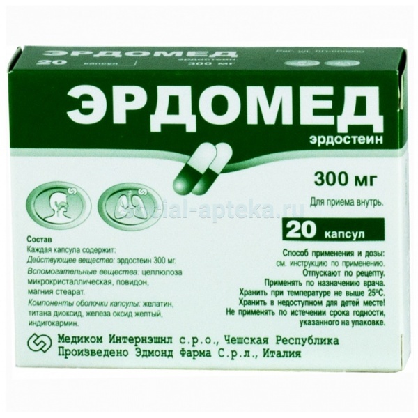 Эрдомед оказывает муколитическое, отхаркивающее действие. Эффективность обусловлена действием активных метаболитов. Тиоловые группы метаболитов вызывают разрыв дисульфидных мостиков, которые связывают волокна гликопротеинов, это приводит к уменьшению эластичности и вязкости мокроты. В результате эрдостеин усиливает и ускоряет освобождение респираторных путей от секрета, улучшает секреторную функцию эпителия и увеличивает эффективность мукоцилиарного транспорта в верхних и нижних отделах респираторного тракта.Эрдостеин местно, посредством аминовых групп, антагонистически действует на свободные радикалы кислорода и препятствует подавлению альфа-1-антитрипсина у табакокурильщиков, тем самым снижает повреждающее действие табачного дыма у хронических курильщиков. Эрдостеин увеличивает концентрацию IgA в слизистой оболочке дыхательных путей у больных с хроническими обструктивными заболеваниями дыхательных путей, а также снижает подавляющее действие табачного дыма на функции гранулоцитов. При совместном применении эрдостеин увеличивает концентрацию амоксициллина в бронхиальном секрете, что позволяет добиться более быстрого ответа на терапию по сравнению с монотерапией амоксициллином. Эффект от терапии препаратом развивается на 3–4 сутки лечения. Эрдостеин, как таковой, не содержит свободные SH-радикалы. Поэтому препарат не оказывает повреждающего действия на ЖКТ, и побочные эффекты со стороны пищеварительной системы не отличаются от эффектов плацебо.Фармакокинетика Быстро абсорбируется в ЖКТ и метаболизируется в печени до 3 активных метаболитов, наиболее важный из которых — N-тиодигликолил-гомоцистеин (метаболит 1 или М1). T1/2 — более 5 ч. Повторное применение не влияет на фармакокинетические параметры. Cmax — 3,46 мкг/мл; Tmax — 1,48 ч; AUC (0–24 ч) — 12,09. С белками плазмы крови связывается 64,5% эрдостеина. Препарат выводится в виде неорганических сульфатов через почки и кишечник. В случае нарушения функции печени отмечается увеличение показателей Cmax и AUC. Возможно увеличение T1/2 при выраженном нарушении функции печени. При почечной недостаточности возможна кумуляция метаболитов.