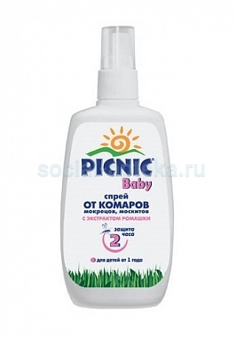 Спрей от комаров Picnic Baby предназначен для деликатной защиты нежной кожи детей от нападения кровососущих насекомых (комаров, москитов, мокрецов). Специальная формула спрея на основе безопасных репеллентов содержит экстракт ромашки, оказывающий противовоспалительное действие на кожу. При нанесении на открытые участки кожи не вызывает раздражения.