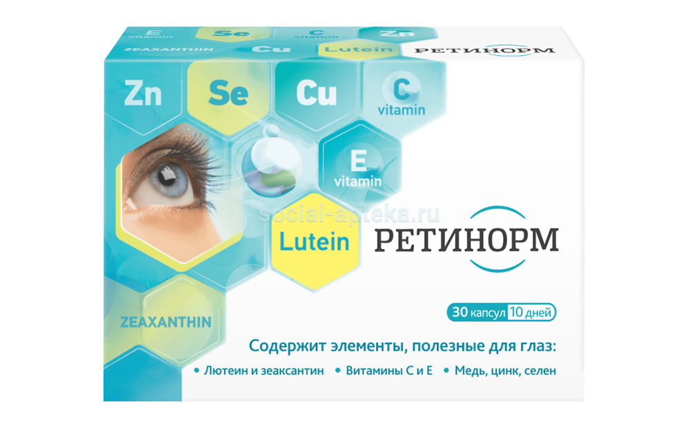 Входящие в состав РЕТИНОРМ лютеин, зеаксантин, витамины С, Е и микроэлементы способствуют нормализации обменных процессов в тканях глаза, снижают риск развития возрастных изменений в сетчатке.