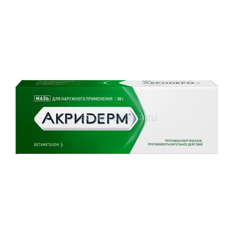 Наружно. Акридерм® мазь наносят тонким слоем на пораженный участок кожи 2 раза в день – утром и вечером, слегка втирая. На участки с более плотной кожей (например, локти, ладони и стопы), а также места, с которых препарат легко стирается, Акридерм® мазь можно наносить чаще. Продолжительность лечения зависит от эффективности и переносимости терапии и составляет обычно не более 4 недель. В течение года возможно неоднократное повторение терапии. Если клиническое улучшение не наступает, необходимо уточнить диагноз. У детей и у больных с поражением кожи лица курс лечения не должен превышать 5 дней.