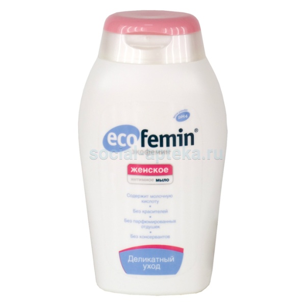 Интимное мыло Экофемин Ощущение чистоты, свежести и комфорта важны для каждой женщины, особенно в интимной зоне. Обрести и сохранить эти ощущения на целый день можно при помощи интимного мыла Экофемин. Использование интимного мыла Экофемин обеспечит деликатный уход даже при очень чувствительных слизистых. Причины просты: РН-показатель мыла 4, в его составе – молочная кислота, что оптимально для слизистых в интимной зоне. Мыло не содержит парфюмированных отдушек, красителей и консервантов. Гипоаллергенно. Преимущества интимного мыла «Экофемин»: поддерживает оптимальный уровень PH интимной зоны; гипоаллергенно; идеально подходит для ежедневного применения, а также в ситуациях, когда слизистые воспалены и имеют микротравмы; Достаточно небольшого количества мыла для полноценной гигиенической процедуры. Уникальная дозирующая крышечка обеспечивает экономичное использование и застрахует от протекания, даже если флакон неплотно закрыт или перевернут. Дополнительную защиту содержимого флакона от загрязнения обеспечивает специальная мембрана. Важные особенности мыла Экофемин для интимной гигиены: благодаря содержанию молочной кислоты и низкому pH 4, мыло отлично подходит для применения в любой ситуации – от интимной гигиены до умывания лица; может использоваться для сухой и раздраженной кожи; может быть использовано всеми членами семьи; может использоваться людьми, склонными к аллергии; возможно к применению при экземе и псориазе; Свойства мыла Имеет кислую среду pH 4, оптимально подходящую для интимной гигиены; Поддерживает увлажненность слизистых; Препятствует сухости и дискомфорту; Поддерживает естественную защиту кожи и слизистых;