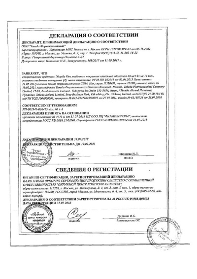 Эдарби® Кло — это комбинированный препарат, в состав которого входят антагонист рецепторов ангиотензина II (АРАII — азилсартана медоксомил) и тиазидоподобный диуретик (хлорталидон). Одновременное применение двух действующих веществ приводит к более выраженному снижению АД по сравнению с таковым при приеме каждого из них в монотерапии. При приеме препарата один раз в сутки достигается эффективное снижение АД в течение 24 ч.Азилсартана медоксомил — одно из действующих веществ препарата Эдарби® Кло — является специфическим антагонистом рецепторов ангиотензина II типа 1 (АТ1). Ангиотензин II образуется из ангиотензина I в реакции, катализируемой АПФ (кининаза II). Ангиотензин II является основным сосудосуживающим фактором РААС, его действие включает в себя сужение сосудов, стимуляцию синтеза и секреции альдостерона, усиление ЧСС и реабсорбцию натрия почками. Азилсартана медоксомил — это пролекарство для приема внутрь. Азилсартана медоксомил быстро превращается в активную молекулу азилсартана, которая избирательно препятствует развитию эффектов ангиотензина II путем блокирования его связывания с рецепторами АТ1 в различных тканях, например в гладких мышцах сосудов и надпочечниках. Поэтому его действие не связано с путем биосинтеза ангиотензина II.Рецептор AT2 также находится во многих тканях, но он не участвует в регуляции деятельности ССС. Аффинность азилсартана к рецептору AT1 в 10000 раз выше, чем к рецептору AT2.Угнетение активности РААС посредством ингибиторов АПФ, подавляющих образование ангиотензина II из ангиотензина I, широко применяется при лечении артериальной гипертензии. Ингибиторы АПФ подавляют также распад брадикинина, который катализируется АПФ. Поскольку азилсартан не подавляет АПФ(кининазу II), он не должен влиять на активность брадикинина. Азилсартан не связывается с другими рецепторами или ионными каналами, играющими важную роль в регуляции ССС, и не блокирует их.Азилсартан дозозависимо подавляет сосудосуживающие эффекты инфузии ангиотензина II. Однократный прием азилсартана в дозе, эквивалентной 32 мг азилсартана медоксомила, подавлял максимальное сосудосуживающее действие ангиотензина II примерно на 90% в момент наибольшей концентрации, и примерно на 60% через 24 ч после приема. У здоровых добровольцев концентрации ангиотензина I и ангиотензина II и активность ренина в плазме крови возрастали, а концентрация альдостерона снижалась после однократного приема внутрь и после повторных доз азилсартана медоксомила; клинически значимое влияние на содержание калия или натрия в сыворотке крови не обнаружено. В целом фармакодинамические свойства азилсартана медоксомила согласуются с блокированием рецептора AT1.Антигипертензивный эффект азилсартана медоксомила развивается в течение первых 2 нед применения с достижением максимального терапевтического эффекта через 4 нед. Снижение АД после приема внутрь однократной дозы обычно достигается в течение нескольких часов и сохраняется в течение 24 ч.Хлорталидон — тиазидоподобный диуретик — подавляет активную реабсорбцию ионов натрия в почечных канальцах (начальная часть дистального извитого канальца нефрона), увеличивая выведение ионов натрия и хлора и усиливая диурез. Кроме того, хлорталидон увеличивает выведение ионов калия, магния и бикарбоната, задерживает