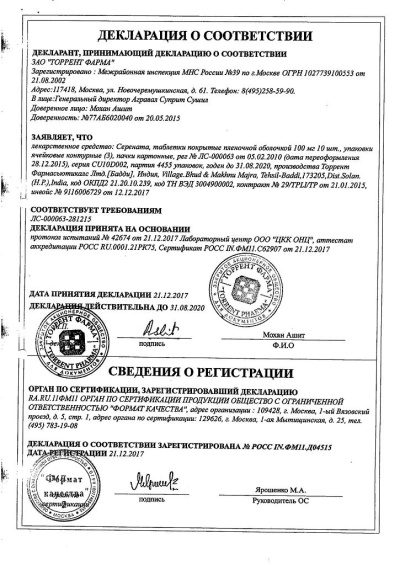 1 таблетка содержит сертралин (в форме гидрохлорида) 100 мг.