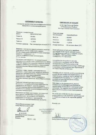 В период лечения Вазапростаном пациентам с признаками почечной и сердечной недостаточности объем жидкости следует ограничить до 50-100 мл/сут. В процессе терапии следует проводить контроль АД, ЧСС, при необходимости – контроль баланса жидкости, измерение центрального венозного давления, проведение ЭхоКГ. Клиническая эффективность лечения оценивается через 3 недели терапии. На фоне терапии Вазапростаном может наблюдаться появление С-реактивного белка при биохимическом иcследовании крови.