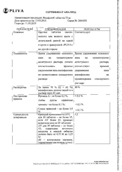 Антидепрессант, химически не относящийся ни к одному классу антидепрессантов (трициклические, тетрациклические или другие), является рацематом двух активных энантомеров. Механизм антидепрессивного действия препарата связан с его способностью потенцировать передачу нервного импульса в ЦНС. Венлафаксин и его основной метаболит О-десметилвенлафаксин (ОДВ) являются сильными ингибиторами обратного захвата серотонина и норадреналина и слабыми ингибиторами обратного захвата допамина. Кроме того, венлафаксин и ОДВ снижают бета-адренергическую реактивность как после однократного введения, так и при постоянном приеме. Венлафаксин не обладает сродством к м-холинергическим, гистаминовым H1-рецепторам и α1-адренорецепторам головного мозга. Не подавляет активность МАО. Препарат не влияет на высвобождение норадреналина из тканей головного мозга.ВсасываниеПосле приема препарата внутрь венлафаксин хорошо абсорбируется из ЖКТ. После однократного приема препарата в дозе 25-150 мг Cmax достигается в течение приблизительно 2.4 ч и составляет 33-172 нг/мл. После приема препарата во время еды время достижения Cmax в плазме крови увеличивается на 20-30 мин, однако величины Cmax и абсорбции не меняются.РаспределениеСвязывание венлафаксина и ОДВ с белками плазмы крови составляет соответственно 27% и 30%. При многократном приеме Css венлафаксина и ОДВ достигаются в течение 3 дней.МетаболизмПодвергается интенсивному метаболизму при "первом прохождении" через печень. Главный метаболит - О-десметилвенлафаксин. Cmax ОДВ в плазме крови достигается приблизительно через 4.3 ч после введения и составляет 61-325 нг/мл.В диапазоне суточных доз 75-450 мг фармакокинетика венлафаксина и ОДВ имеет линейный характер.ВыведениеТ1/2 венлафаксина и ОДВ составляют соответственно 5 и 11 ч. ОДВ и другие метаболиты, а также неизмененный венлафаксин, выводятся почками. При многократном введении Css венлафаксина и ОДВ достигаются в течение 3 дней.Фармакокинетика в особых клинических случаяхУ больных с циррозом печени концентрации в плазме крови венлафаксина и ОДВ повышены, а скорость их выведения снижена.При почечной недостаточности умеренной или тяжелой степени (КК менее 30 мл/мин) общий клиренс венлафаксина и ОДВ снижается, а Т1/2 увеличивается.Возраст и пол пациента не влияют на фармакокинетику препарата.